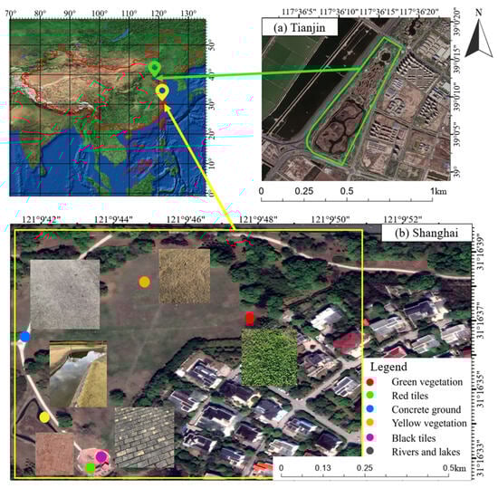 Figure 3. Experimental area geographic location and sample points. (a) Tianjin experiment area. (b) Shanghai experiment area and sampling points.