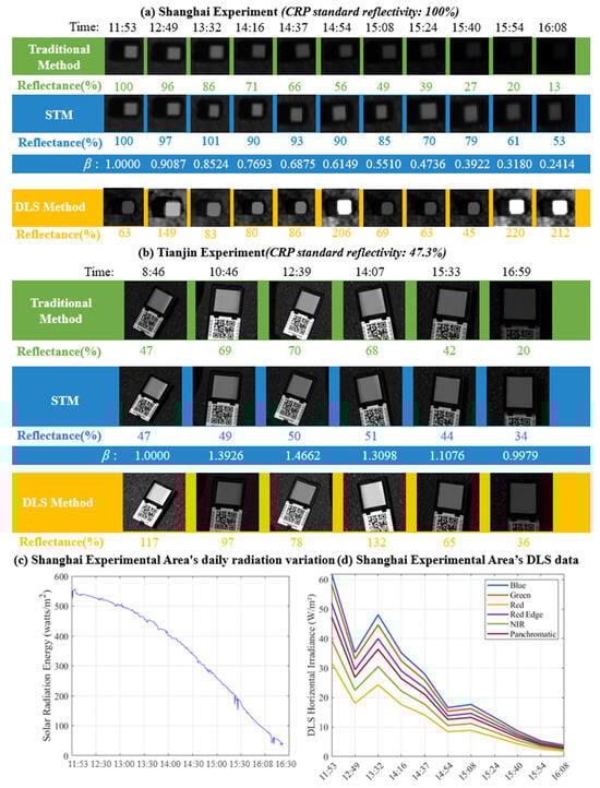In the Tianjin experiment, the CW-15 UAV captured CRP images every 1.5 to 2 h, simulating real long-endurance UAV mission conditions. The CRP reflectance in the Tianjin experiment was 47.3%, with the traditional method’s CRP reflectance rising to 70% in the morning and dropping to 20% in the afternoon. In contrast, the STM’s reflectance remained stable between 34% and 50% throughout the day. The RMSE indicated deviations from the standard reflectance of 100%. In Shanghai, the RMSE for the traditional method was 52.08%, while the DLS method yielded an error of 66.19%. The STM’s RMSE achieved 15.80%, reducing errors by about 37% and 51% compared to the other two methods. In Tianjin, the RMSEs for the traditional method and the DLS method were 23.98% and 64.57%, respectively, while the STM achieved an error of 7.72%, reducing errors by 16% and 56%, respectively.