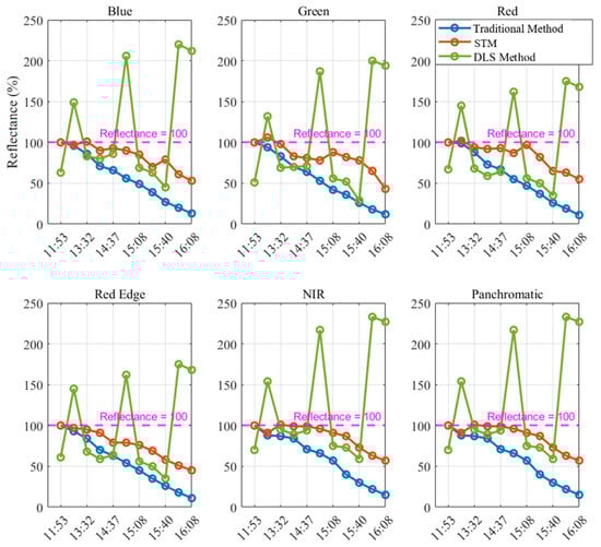Figure 7 presents the reflectance results for all bands across the three methods in the Shanghai test area. The reflectance calculated using the DLS method remained mostly stable, between 100% and 60%, but significant errors occurred at certain times, with notable fluctuations in the green line. In contrast, the reflectance using the STM showed minimal differences between bands, with the red line gradually declining and stabilizing between 100% and 70% across all bands. The blue line, representing the traditional method, showed no significant fluctuations, but the overall reflectance was lower than the red line. The reflectance of the traditional method remained mostly stable, between 100% and 20%. This indicates that the STM effectively reduced errors and improved accuracy across all bands in the multispectral camera.