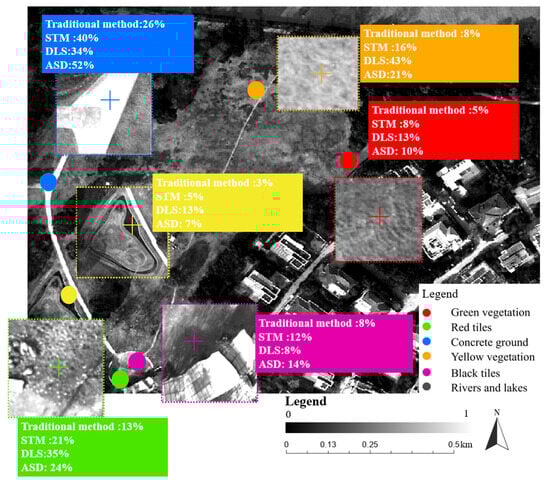 Reflectance data for six features were measured using an ASD spectrometer across six bands. Figure 9 shows the reflectance values in the blue band, calculated using the traditional method, the STM, DLS data, and ASD spectrometer measurements. The remaining bands are shown in Table 3.
