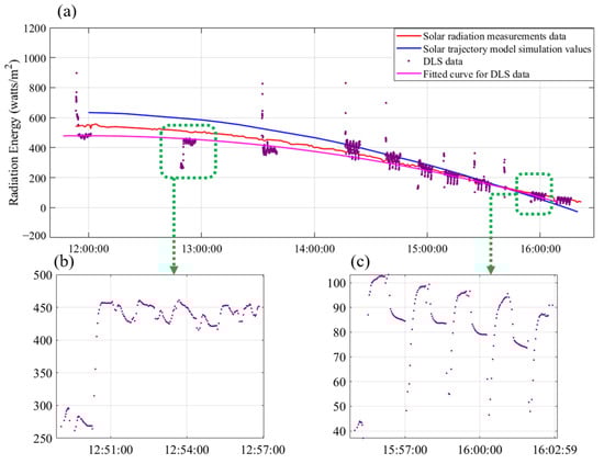 The UAV deployed in the Shanghai experimental area was equipped with a DLS, enabling the recording of downwelling solar radiation during each flight. Additionally, solar radiation measurements were conducted on the ground, starting from noon, to record baseline solar radiation values. This setup facilitated a comparative analysis of the solar radiation values simulated using the STM, those recorded by the DLS, and those measured on the ground. Figure 10a presents the results of solar radiation values obtained from these three methods. Since the DLS data can only be recorded during the UAV’s flight, purple dots are used to represent these data points, with densely clustered regions indicating a single flight session. For a clearer comparison, least squares fitting was employed to model the DLS-recorded points, represented by the purple line in Figure 10. It is evident from the figure that the curvature of the three datasets is similar, accurately capturing the decline in solar radiation values over time. However, it is worth noting that the solar radiation values recorded by the DLS exhibited significant fluctuations during a single flight session. This variability is illustrated in Figure 10a, where many purple dots deviate from the modeled purple line.