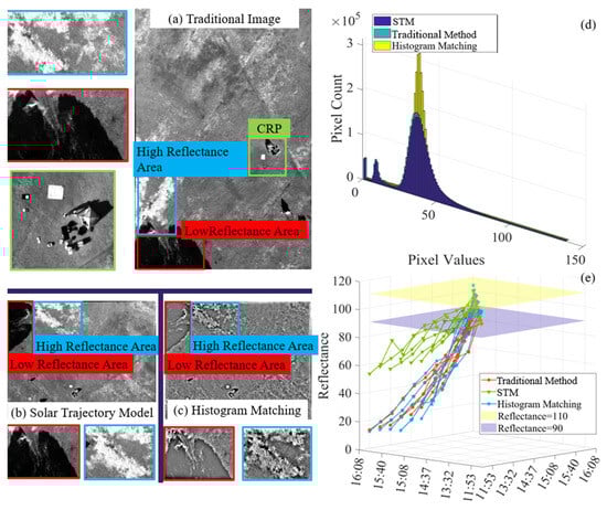 Figure 11. (a) Traditional method image (b) Image after STM correction. (c) Image after histogram equalization. (d) Histogram of pixel distribution for three types of images. (e) Line chart of CRP reflectivity for three methods.