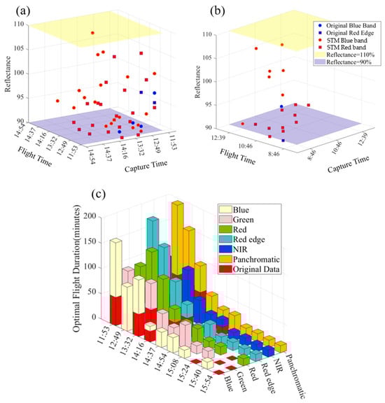 Figure 12c presents the changes in optimal flight duration before and after correction, with red bars for the traditional method and various colors for the corrected data. Overall, corrected optimal flight durations exceed traditional method values, particularly around noon. Although slight variations exist among bands, they are not significant, with the blue band, red edge, and Panchromatic showing longer durations. Optimal flight durations peak at noon, extending over 100 min with corrections, before declining in the afternoon.
