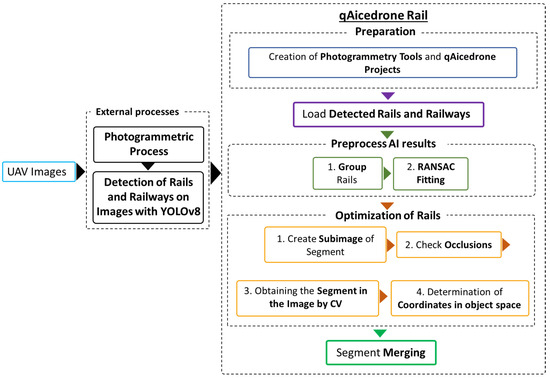 The workflow of the methodology can be divided into three main steps. First, after the images were acquired, the photogrammetric process was computed to generate 3D data and an orthomosaic. Next, a semantic segmentation pretrained model based on YOLOv8 was applied to the original images to detect rail and railway polygons. Rail refers to each one of the individual tracks or steel bars, while the railway encompasses the two rails and the space between them. Finally, the photogrammetric data, images and polygons were loaded into the qAicedrone tool, where the optimization of the railways was carried out. The methodology was fully integrated into QGIS [25], an open-source software, through two dedicated plugins (Photogrammetry Tools and qAicedrone). The workflow is presented in Figure 1.
