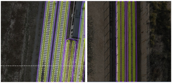 As the presented methodology pretends to improve the rails obtained directly by computer vision, the results of the rail optimization process were compared to the AI detections after these segments were grouped and fitted to lines using RANSAC (as explained in Section 2.4.3) (Figure 8), and the recall and precision are presented in Table 3.