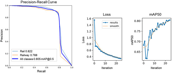 After several tests, the optimal parameters for training were obtained. The learning rate was set to 0.01, with a 0.0005 decay and 0.937 momentum, the chosen optimizer was Stochastic Gradient Descent (SGD), and training was carried out for 25 epochs. The initial resolution of 640 × 640 pixels was maintained. A general mean Average Precision of 0.805 was obtained at 0.50 (mAP50). For classes, the mAP50 was slightly better for rail, with a value of 0.82, while for railways, an mAP50 of 0.79 was achieved (Figure 4).