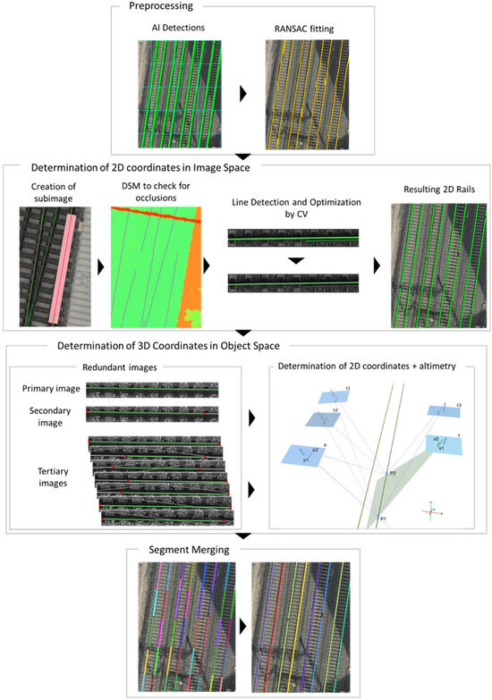 The visualization of the qAicedrone processing steps. Firstly, preprocessing is carried out, the rails and railways are detected by AI on the individual images and RANSAC is applied to obtain the best fitting lines per group of rails. The 2D coordinates of the rails are improved by using CV. Using the optimized 2D coordinates and the redundant images, the 3D coordinates of the rails are determined. Finally, the rail segments are merged, assigning the same id to segments belonging to same rail (ids are represented as colors).