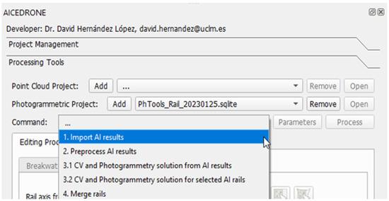 Firstly, a Photogrammetry Tools project is created, and the photogrammetric data previously obtained are loaded. Afterwards, the qAicedrone project is established, linked to the Photogrammetry Tools project. This ensures seamless integration between photogrammetric data processing and segmentation, allowing for more refined rail modeling in 3D space. Once both projects are prepared, the rail detection and optimization steps are carried out. The steps of qAicedrone are visible in Figure 6.