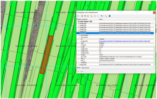 The YOLO detections, formatted in WKT, are imported using the qAicedrone tool’s “Import AI Results” function. This process automates the transformation of detected polygons from image space to object space using Photogrammetry Tools. For the railway detections, each polygon’s main axis is defined, and a uniform polygon width of 0.5 m is applied to maintain consistency in the analysis (Figure 7).