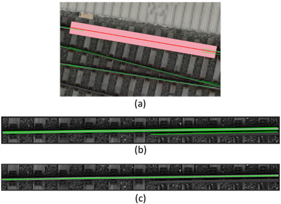 Figure 9. Visualization of obtainment of rail segment in image by CV. Created rectangle (a), subimage with detections before processing (b), subimage with processed detection (c). - Occlusion detection: The system checks for potential occlusions by comparing the segment’s edges with the corresponding DSM. If an occlusion is detected (where the image’s projected point is above the DSM point), the segment is discarded.