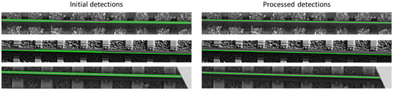 In most cases, the initial detections result in lines at both sides of the rail with important gaps. After processing, the result is a single line in the center of the rail with no gaps (Figure 10).