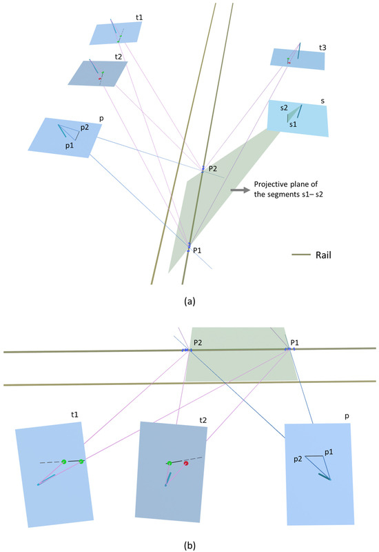 - The precision for the point is obtained using the tertiary images (t1, t2 and t3 in Figure 11). Ideally, with no error, the projection of the 3D points in the tertiary images would belong to the axis of the rail in that image. The error is computed as the distance in pixels between the projection of the point in the image and the segment in the image. Each projection of the point in a tertiary image is considered an outlier if the error is above a threshold (3 pixels by default) (Figure 11b).The outcome of this process is a set of points that could be part of the rail segment, as well as the number of inliers and the RMSE for each one. These coordinates are transformed into the project coordinate system.