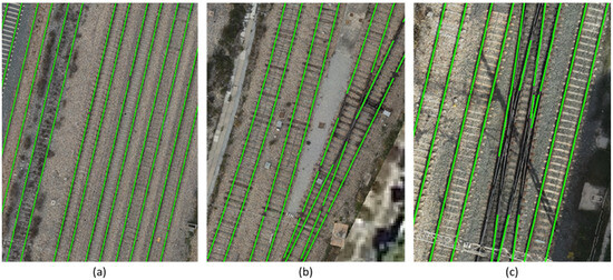 A visual validation of the results is presented. For areas of low complexity, the only visible errors are small gaps along the rails. These gaps are caused by occlusions (e.g., posts, wiring and other structures) that hamper AI detection. Due to their size and frequency, they are considered a minor problem. In most cases, small gaps can be ignored as they will be assigned to the same rail in the merging process (Figure 16a).