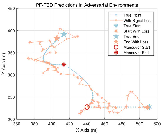 As illustrated in Figure 4, the performance of traditional particle filter (PF) algorithms degrades significantly in scenarios involving abrupt maneuvers and intermittent signal loss. These challenges underscore the limitations of conventional PF approaches in maintaining reliable tracking under complex adversarial conditions. Therefore, relying solely on traditional particle filtering is insufficient for effective target tracking under adversarial conditions. It necessitates integrating advanced methods that can adapt to dynamic changes and handle corrupted or missing data.