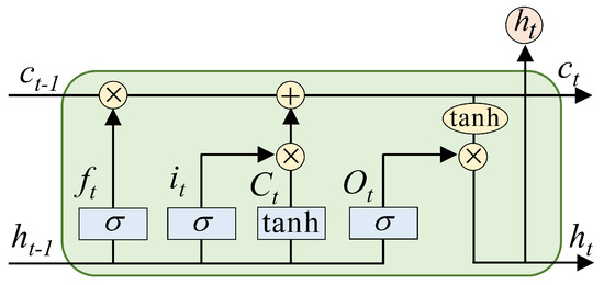 The operations within a single LSTM cell at time step t are defined by the following equations
