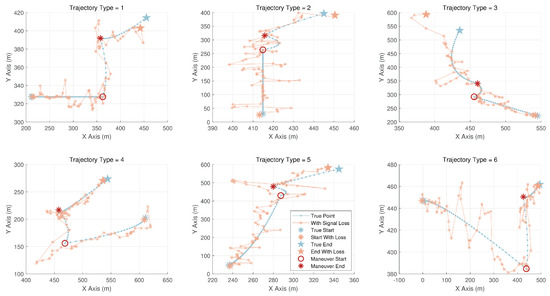 In the maneuver phase (), the motion state undergoes abrupt changes. The acceleration and velocity are randomly selected from predefined distributions or ranges, denoted as and , respectively, independent of the previous phase. The position is carried over from the end of the start phase, i.e., . This phase simulates abrupt maneuvers such as turning or changing direction, with both acceleration and velocity being randomly adjusted to reflect unpredictable changes in the AUV’s motion.