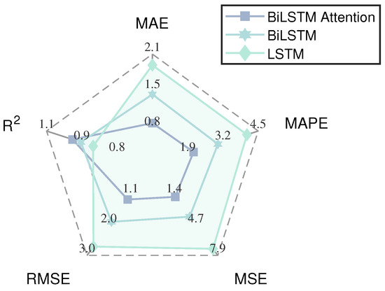 As illustrated in Figure 14, the BiLSTM-Attention model exhibits a significant reduction in prediction error, achieving a mean absolute error (MAE) of 0.90614 on the test set. This is considerably lower than that of LSTM (MAE = 1.919) and BiLSTM (MAE = 1.4079). Additionally, the mean square error (MSE) reinforces these findings, with BiLSTM-Attention attaining an MSE of 1.5599, in stark contrast to the MSE values of 3.7198 for BiLSTM and 7.211 for LSTM.