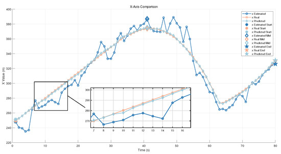 Comparison of estimated, predicted, and real positions of target over time in X-coordinate.