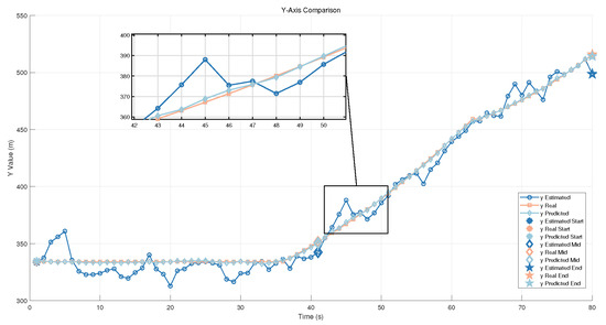Comparison of estimated, predicted, and real positions of target over time in Y-coordinate.