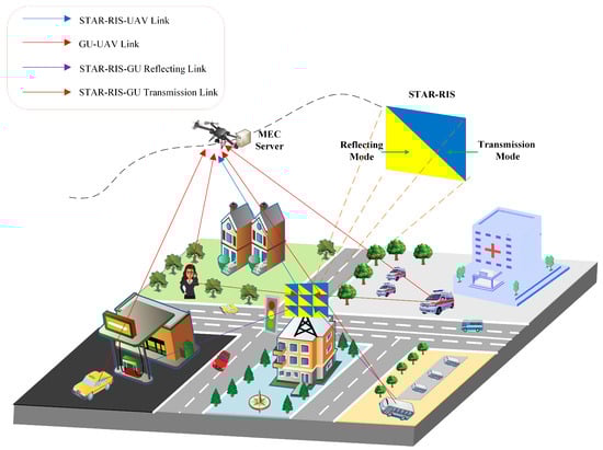 To address these challenges, reconfigurable intelligent surface (RIS) have been introduced to improve energy efficiency and communication stability in UAV–MEC systems [6,7,8]. Recent studies have explored combining UAV and RIS to optimize communication quality and energy consumption [9,10,11]. However, traditional RIS only reflect signals, limiting their coverage. To overcome this, simultaneously transmitting and reflecting reconfigurable intelligent surface (STAR–RIS) have been proposed, enabling 360-degree full-space coverage and enhanced signal propagation [12,13,14].