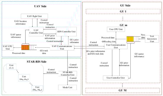 As shown in Figure 2, the system consists of three modules, namely the UAV module, GU module, and STAR–RIS module. The Software–Defined Networking (SDN) controller decouples the forwarding plane and control plane of network devices, managing network devices, orchestrating network services, and scheduling business traffic through controllers. The SDN controller deployed on the UAV collects real-time network environment information of the entire system and develops a resource allocation scheme in a programmed manner based on the collected information to improve system performance. Specifically, the system information (task generation volume, trajectory, queue length, etc.) of GUs, STAR–RIS, and the UAV is transmitted to the SDN controller, which quickly generates a reasonable resource allocation scheme by executing the algorithm described in this paper. Furthermore, the system transmits control decisions to the UAV, GUs, and STAR–RIS through the communication units of each module. In this process, GUs, upon receiving control commands from the SDN controller, offload tasks to the UAV through their communication units. The UAV, after receiving control commands from the SDN controller, accepts the offloaded tasks through its communication unit and adjusts its flight trajectory via its flight control unit. Simultaneously, STAR–RIS, upon receiving control instructions from the SDN controller, adjusts its mode and phase through its control unit. By reflecting or transmitting GU signals, STAR–RIS improves the channel conditions between GUs and the UAV. These three modules work collaboratively to effectively execute control decisions and allocate resources efficiently and reasonably.