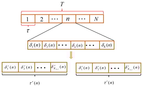 Time Division Multiple Access (TDMA) is a well–established transmission technique widely used in IoT communication networks, effectively avoiding GU interference through precise phase alignment in each sub–slot [30]. Compared to Frequency Division Multiple Access (FDMA), TDMA reduces inter–user interference by approximately 10% in dynamic environments [31], making it particularly suitable for the flexible and changing topology of STAR–RIS–assisted UAV–MEC networks. Therefore, this paper adopts TDMA communication. In this system, the n-th time slot divides GUs into two sets. The first set is the reflection GUs, with a quantity of , represented by , and the second set is the transmission GUs, with a quantity of , represented by , and satisfies . Since STAR–RIS can quickly change the phase angle matrix, it is difficult to switch between reflection and transmission modes quickly; we designed a dedicated time slot partitioning protocol as shown in Figure 3. Each time slot is further divided into sub–slots, with the th GU offloading task data in the corresponding sub–slot while satisfying constraints