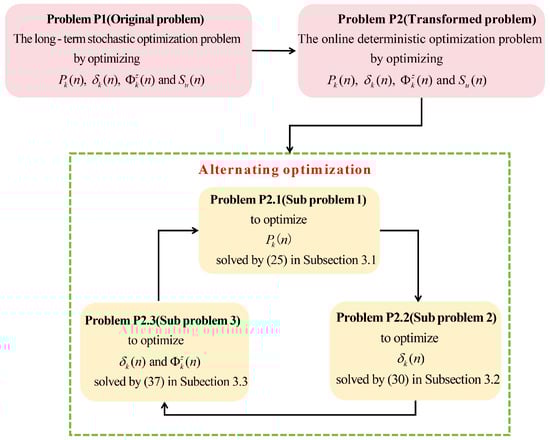 As shown in Figure 4, after converting to , the problem is rephrased as an online optimization problem. In , there is a serious coupling relationship between optimization variables, which makes it difficult to solve this problem. To solve this problem, we will transform it into three subproblems that can be alternately optimized and solved: (1) optimization of transmission power; (2) time slot allocation; (3) optimization of UAV trajectory and intelligent reflector phase matrix. Then, we can alternately solve the three subproblems until the change in variables is less than , thus obtaining an approximate solution to the objective function.