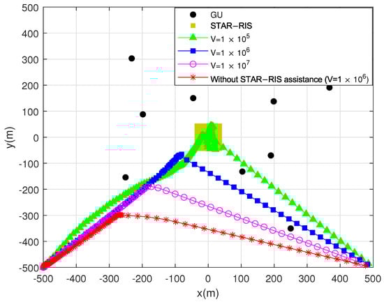 Figure 5 shows the flight trajectories of the proposed scheme and UAV without STAR–RIS assistance under different Lyapunov control factors. As shown in the figure, in the proposed scheme, the larger the penalty coefficient V, the shorter the UAV’s flight distance. This is because an increase in V indicates a higher weight of energy consumption, and the system will be more focused on energy consumption. Therefore, UAV reduces its flight distance to achieve energy savings, which corresponds to the theoretical results in (48). Specifically, when occurs, the system will pay more attention to queue stability, so UAV will hover near STAR–RIS to obtain better channel gain for GUs and handle more tasks. When occurs, the system begins to focus on energy consumption, gradually shifting its focus from queue stability to energy consumption, shortening the UAV’s flight distance. As V continues to increase until occurs, the system will pay more attention to energy consumption, further shortening the UAV’s flight distance. In addition, in UAV–MEC systems without STAR–RIS assistance, due to the extremely harsh communication environment, the UAV chooses shorter flight distances to reduce energy consumption.