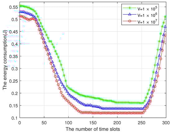 Figure 7 illustrates the variations in system energy consumption under different control factors V. At the initial stage of UAV task processing, the communication channel gain is relatively low due to the UAV’s distant position from the GUs and the STAR–RIS. This results in higher energy consumption for transmission tasks, as more power is required to maintain reliable communication over a weaker channel. Consequently, the total energy consumption is initially high. As the UAV moves closer to the center area of the GUs and the STAR–RIS over successive time slots, the channel gain improves significantly. This improvement reduces the energy required for transmission tasks, leading to a gradual decrease in total energy consumption. However, when the UAV reaches its final position, the channel gain begins to decrease again due to the increased distance from the GUs or potential obstacles, causing a corresponding rise in energy consumption. Furthermore, the control factor V plays a critical role in balancing energy consumption and system performance. As V increases, the system places greater emphasis on minimizing energy consumption, which is achieved by optimizing the UAV’s trajectory and transmission power allocation. This results in a noticeable reduction in system energy consumption, as demonstrated in Figure 7. This behavior aligns with the theoretical framework established in (47), which highlights the trade–off between energy efficiency and system performance controlled by V.