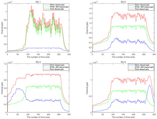 Figure 8 provides the channel gains of four GUs. The total channel gain is the sum of the direct channel gain and STAR–RIS channel gain. As can be seen from the figure, the channel gain brought by the STAR–RIS auxiliary system makes the total gain of each GU much higher than the direct channel gain, greatly improving the communication quality between GUs and the UAV. Furthermore, all three channel gains gradually increase as the drone approaches GUs and STAR–RIS, and due to different positions, GUs enjoy different STAR–RIS gains. GUs closer to STAR–RIS have greater channel gains when communicating with the UAV.