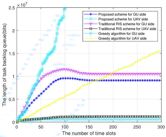 In Figure 9, we plot the change curves of the task backlog queue for our proposed scheme and two benchmark schemes. From Figure 9, it can be seen that if the greedy algorithm is used, the system only focuses on the current optimal resource allocation and does not pay attention to long–term system stability, resulting in more intense competition among GUs and the inability to maintain queue stability. This algorithm that only considers current interests leads to a continuous increase in task queue backlog, resulting in a decrease in system performance and affecting GU experience. In addition, the scheme proposed in reference [34] uses traditional RIS to optimize the unmanned aerial vehicle–mobile edge computing (UAV–MEC) system. While this method does achieve stable results, the length of the queue backlog remains longer compared to our proposed scheme. The reliance on traditional RIS introduces limitations due to its static positioning, which hinders efficient resource utilization and prolongs the processing delays. Therefore, STAR–RIS is introduced in the model of this paper to avoid the positional defects of traditional RIS. STAR–RIS can be dynamically deployed at the center position of ground users (GUs), providing significant channel gain improvements. This adaptability ensures that the communication links are consistently optimized, thereby enhancing overall system performance. At the same time, a low–complexity and highly efficient resource allocation algorithm is designed to effectively reduce queue backlog. This algorithm takes into account both current and future resource demands, ensuring balanced and stable queue lengths. By intelligently allocating resources and leveraging the enhanced capabilities of STAR–RIS, our proposed scheme outperforms existing methods in maintaining system stability and reducing task backlog.