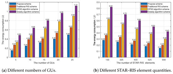 The energy consumption via different environment parameters. (a) The energy consumption of different numbers of GUs. (b) The energy consumption of different STAR–RIS element quantities.