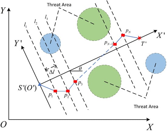- Initialize UAV flight path information. First, transform the coordinate system according to Equation (1). In the new coordinate system, randomly assign initial positions to the gray wolf population, which will represent the initial trajectory of the UAV. Calculate the fitness value of each individual using the objective function , and select the best individual to set as .