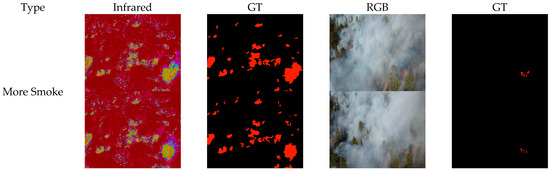 In the equation, ∣a∩b∣ represents the intersection of regions a and b, and ∣a∪b∣ represents the union of regions a and b. The IoU value ranges within [0, 1]. The following sections present the quantitative and qualitative experimental studies on the flame segmentation performance of the infrared and visible light imagery within the aerial forest fire images, along with an analysis of the experimental results. In the subsequent quantitative comparisons, “↑” indicates that a higher value corresponds to better performance, while “↓” indicates that a lower value corresponds to better performance.