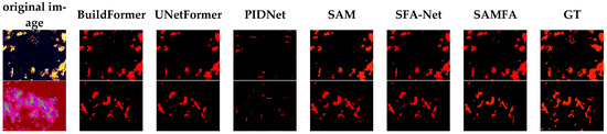 The SAMFA algorithm is qualitatively compared with the aforementioned five advanced algorithms, and three images are randomly selected from the test set for display. Due to the abundance of flame targets, marking them would reduce readability; therefore, no significance markers (such as circles or boxes) are applied to the comparison images. The same applies to the subsequent experiments, as detailed in Figure 10. As illustrated in the figure, the overall density of fire points is high in the infrared images. In the first row, only the BuildFormer, SFA-Net, and SAMFA algorithms successfully segment the fire points located at the upper part of the image, while PIDNet segments only sporadic areas of flame, and UNetFormer and SAM miss detections. Among them, the SAMFA algorithm exhibits the best segmentation performance. In the second row, focusing on the flame area at the bottom right of the image, only SAMFA demonstrates good recognition performance, followed by BuildFormer, SAM, and SFA-Net, whereas UnetFormer and PIDNet perform relatively poorly. In the third row, where the image contains numerous flame targets, SAMFA and SFA-Net identify the most flame targets, followed by BuildFormer, UnetFormer, and SAM. Additionally, it is observed that PIDNet identifies flame targets sparsely, resulting in poor performance. In summary, the SAMFA algorithm exhibits superior flame segmentation performance, followed by SFA-Net and SAM.