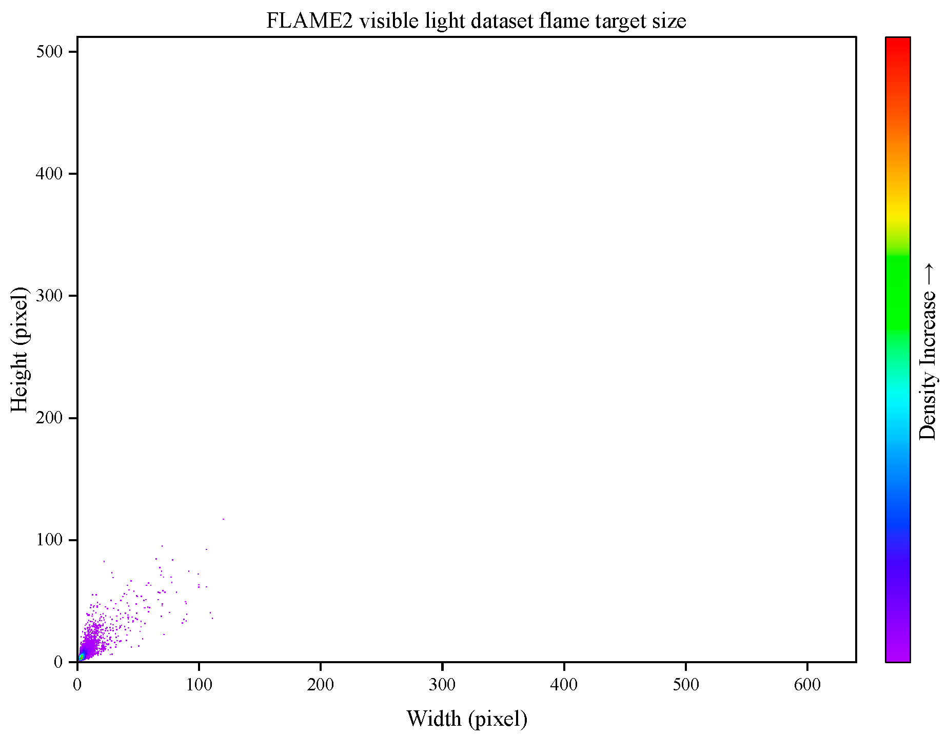 To better accommodate fire scenarios, the 700 visible light images in FLAME2 were annotated, and the sizes of the annotated masks were visualized, as shown in Figure 3. As illustrated, the masks in the visible light dataset are generally small, similar to the flame targets in aerial forest fire images, indicating the reliability of the data.