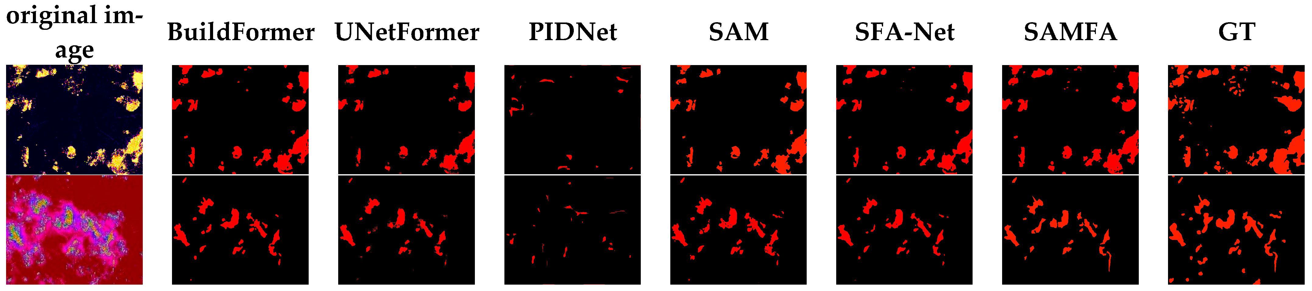 Table 3 presents the quantitative comparison of hyperparameters for all algorithms. As shown in the table, in terms of FLOPs, UnetFormer performs the best, followed by SFA-Net and PIDNet, with values of 14.63 G, 47.04 G, and 47.86 G, respectively. In terms of L_Params, SFA-Net exhibits the best performance, followed by SAMFA and UnetFormer, with values of 10.57 M, 11.58 M, and 11.67 M, respectively. Regarding Params, SFA-Net also performs the best, followed by UnetFormer, with values of 10.57 M and 11.67 M, respectively. From the above, it can be concluded that UnetFormer and SFA-Net have the lowest hyperparameters and the best performance. Additionally, compared to SAM, SAMFA reduces L_Params by 96.76%, significantly decreasing computational resource consumption.