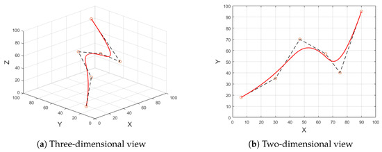 This paper uses the cubic B-spline curves () to smooth the UAV flight trajectories because they can handle complex geometries with high precision and smoothness [61]. An example of the cubic B-Spline curves with six control points is shown in Figure 2a and Figure 2b, respectively.