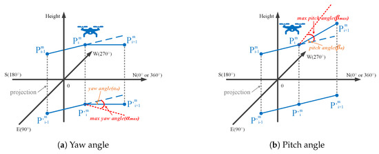 The inherent maneuverability of UAVs restricts their turning to specific angle ranges. The yaw and pitch angles are critical for maintaining the orientation of UAVs in horizontal and vertical directions, respectively. The yaw angle determines the heading of UAVs in the horizontal plane, ensuring proper directional control towards the target. The pitch angle regulates the tilt of UAVs in the vertical plane, influencing altitude changes and its ability to climb or descend. An example of the yaw angle and pitch angle for the m-th UAV in the i-th waypoint are illustrated in Figure 3a and Figure 3b, respectively.