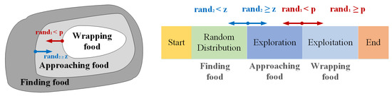 where t is the index of the current iteration. and represent slime mold positions in the current and the next iteration. and represent the upper and lower boundaries of the search space, respectively. and are random numbers within the interval . z is a small constant, typically set at 0.03, indicating the percentage of individuals within the slime mold that find food randomly.