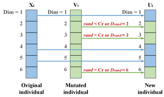where refers to the problem dimension and represents the random integer in the interval of . is the random value in the interval of . denotes the crossover parameter.