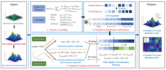 For this reason, this paper proposes a self-adaptive improved slime mold algorithm (AI-SMA) and applies it to multi-UAV path-planning problems. First of all, inspired by the ranking-based differential evolution (rank-DE), a novel search mechanism is introduced. Rank-DE is characterized by its simplified architecture and rapid operational speed, which effectively improves the exploration capability of the algorithm while maintaining computational complexity [52]. By combining the excellent exploration qualities of rank-DE with SMA, AI-SMA can achieve a better balance between exploration and exploitation. Subsequently, a self-adaptive switch operator is designed, featuring a non-linear transition that adapts with increasing iterations. This dynamic operator can maintain population diversity in later stages and reduces the likelihood of premature convergence. Lastly, a self-adaptive perturbation strategy is implemented to provide a new direction for population evolution by making slight adjustments to the positions of individuals. This strategy enables the algorithm to escape local optima while accelerating convergence speed.