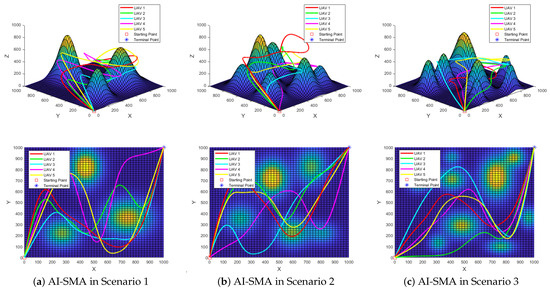 Furthermore, a three-dimensional complex terrain model with various obstacles is established, and the cubic B-spline curves are utilized to smooth the flight trajectory. The cost function considers five key factors: flight distance, flight height, flight turning angle, collisions between UAVs and obstacles, and collisions among multiple UAVs. To validate the optimization capabilities of AI-SMA, the algorithm was tested against well-established meta-heuristics on the CEC 2017 benchmark test suite and various multi-UAV path-planning scenarios. The primary contributions of this study are summarized as follows: