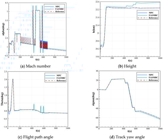 Furthermore, under same simulation conditions, we studied the tracking control problem under no-fly zone constraints using the finite-time adaptive sliding mode back-stepping controller (FASMBC) proposed in Ref. [36], with the corresponding results depicted by green solid lines in Figure 7. Comparative analysis reveals that the proposed model predictive control framework demonstrates superior tracking accuracy and flight stability in lateral maneuver trajectory tracking with no-fly zone constraints, particularly showing enhanced constraint-handling capabilities when addressing complex operational scenarios involving restricted airspace.