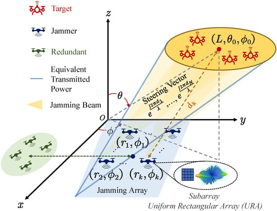 Electronic warfare is an important form of modern warfare. Jammers interfere with communication systems by emitting electromagnetic waves, affecting the quality of communication and reducing combat effectiveness [1,2,3,4,5,6]. The increase in the dimensions of combat has put forward higher requirements for the coordination between equipment. This has made coordinated electronic jamming a development trend in electronic warfare. Coordination between jammers can extensively play to their respective advantages and minimize the impact of the shortcomings of individual jammers on the entire jamming system. Distributed beamforming has been widely used in coordinated jamming due to its high directivity and flexibility. This technology uses the coordination between array elements to optimize the main beam and half-power beamwidth and suppress sidelobes to achieve higher-quality power transmission [7,8,9]. These papers studied the impact of frequency and phase errors between nodes on beam efficiency. They used phase prediction models to estimate errors, track the drift of signals, and implement beam correction through probabilistic adaptive direction adjustment techniques. They proposed average received power and the amount of information exchange as evaluation indicators of the model’s overall performance. UAVs carry array elements due to their high mobility to achieve more efficient energy transmission [10]. Based on a nonlinear energy harvesting model, this paper proposed an energy efficiency maximization problem, which mainly involves the optimization of analog beamforming, trajectory planning, and transmission power control. The authors simplified the complex three-dimensional uniform linear array and designed a convex optimization iterative algorithm, which improved the convergence speed of the algorithm and achieved beam concentration. In addition to adjusting the positions of nodes to change the phase, directly adjusting the signal’s phase can gather more energy in the target area. The author proposed a phase adjustment algorithm in [11], similar to the Fresnel zone plate focusing principle. The far-field transmitter is constructively superimposed in the target area. Experiments have shown that the proposed method can produce a high-energy beam in the target area.