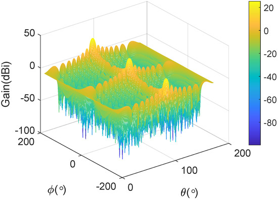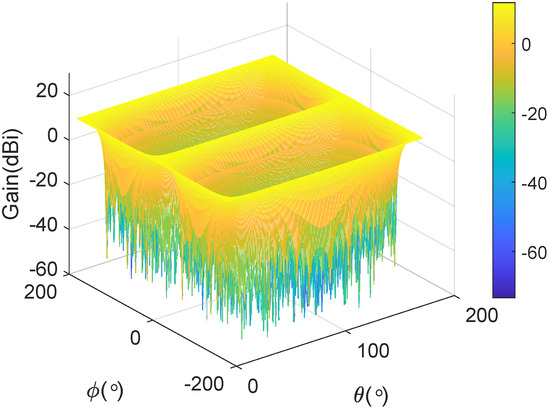 where is the number of elevation grid points and is the number of azimuth grid points. The gain of the uniform linear array (ULA) is shown in Figure 2, which is composed of 16 isotropic antennas, assuming and of the target are 0 and , respectively, and the space between the nodes is . In the horizontal direction, the main lobe is concentrated at and . The symmetry in the gain pattern around these angles suggests that the array has a balanced radiation profile in the horizontal plane. The gain pattern exhibits uniform amplitude distribution in the vertical direction, implying that the ULA maintains consistent radiation characteristics across different elevation angles. The side lobes, visible at other angles, have significantly lower gain, indicating effective suppression of unwanted radiation in non-primary directions.