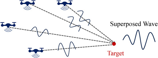 Each node emits a directional jamming beam aimed at the target, as shown in Figure 4. These beams overlap at various positions in space, resulting in varying degrees of constructive and destructive interference. If these beams arrive at the target point simultaneously and are perfectly aligned in phase and frequency, the strongest interference effect can be achieved at the target location, maximizing the interference across the entire space.