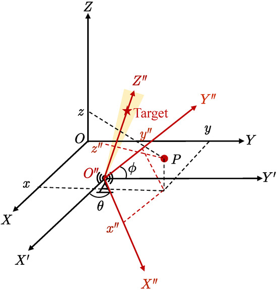 In order to calculate , node k is regarded as the origin of the coordinates, and the z axis is the target’s direction. As shown in Figure 5, the coordinate is transformed. Assume is a point in the coordinate system. First, move the origin point to node k, whose coordinates are ; secondly, rotate counterclockwise with z as the axis, and then rotate counterclockwise with y as the axis.