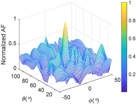 The 16 UAV nodes are distributed in the plane, the distributed radius R is 5 m, the distance is 1000 m, and the carrier frequency is 400 MHz. The normalized array factor is shown in Figure 6, and the azimuth and elevation angles of the target are and , respectively. The amplitude of the main lobe is significantly higher than that of the side lobe. Compared with the uniform array, the random array shows a more focused distribution of the field pattern.