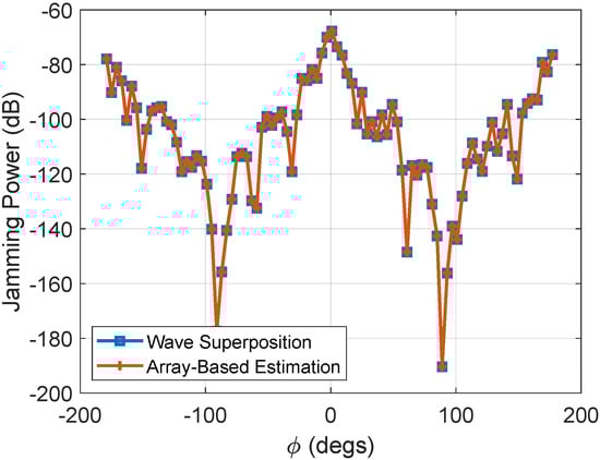 In order to verify the rationality of , the jamming power results are compared between (23) and (17). The carrier frequency is , the number of nodes is 16, which are distributed in the plane, and the array radius is 5 m. The distribution of the jamming power is shown in Figure 8. The wave-superposition method could be regarded as the true value of the jamming power; the curves of the two algorithms are basically the same, and the estimated jamming power at every azimuth angle is almost equal to the true value.